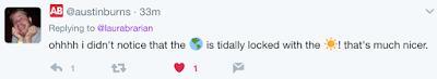 It was clever to position the world in an orbit. If you look at the black and white grid with your eyes crossed, it's even elliptical. I especially liked having the same side face the sun all the time, making ng that side go OW OW OW OW. Missed the sun's rays until Laura pointed them out-very nice. I agree, the uncircled rebus in the middle was the cherry on top.