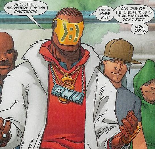 I like the contemporary, computer-related clues and answers. In this puzzle, see also 25A: One listed on MySpace (friend). I wanted to use this appearance of the word "emoticon" in a puzzle to call attention to my favorite new comics characters, whose name is, in fact, Emoticon. He appears in the debut issue of Welcome to Tranquility, a comic about a town where old (WWII-era) heroes and reformed villains come to live out their retirement years in, well, tranquility. The whole town is very small-town America circa 1950. So this upstart young kid named Emoticon comes into the diner and starts making trouble. His schtick => his face (or mask) shows only emoticons, and he speaks partially in chatroom-speak, saying things like "LOL" and "All Caps" out loud. Here's a picture, which I love primarily for the gigantic EMO chain around his neck: