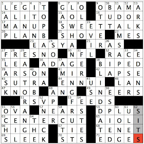 Like many, probably, I wrote in CONAN O'BRIEN at first for 1A: TV host who won a Best Comedy Album Grammy (JIMMY FALLON), but "LAS Meninas" made me realize very quickly that I had the wrong host in there. I watch "Late Night" off and on, so the Fallon-related answers, IRISH and SNL, ended up being gimmes. After the NW was done, I kind of stalled out—had real trouble moving over to the NE. Got lucky in that the only three answers I had any confidence in over there (TICKS, A LA, and something TEA) made BLOCKADES pop right into view. Not much trouble in that quadrant after that. Toughest part for me was probably the lower middle. Could not, at all, see "A TOAST!" (47A: Reception opening). Also had CONCEDE for CONSIGN (44D: Hand over (to)), couldn't come up with OATS, and needed some of those long Downs at the bottom in order to come up with "ALANIS" (48D: Self-titled debut album of 1991). The easiest section was probably the SW, since I got both SHOOT 'EM UP (great answer) and ITALICIZE off their first letters.
